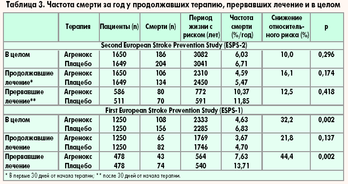 В таблице 3 показано общее значимое различие в снижении относительного риска (СОР) смерти в исследовании ESPS-1, где существенная часть пациентов прервала терапию (СОР=44,4%, р=0,002). Анализ 147 смертей в группе продолжавших терапию в ESPS-1 выявил недостоверное СОР на 21,8% в группе дипиридамола по сравнению с плацебо (р=0,137). Стандартизация по возрасту с помощью Сох-анализа снижает этот показатель до 19,6% (р=0,188). В ESPS-2 зарегистрировано 240 смертей в группе продолжавших лечение со стандартизованным по возрасту недостоверным СОР 20,7%. Таким образом, стандартизованное по возрасту СОР у продолжавших лечение пациентов согласуется в обоих исследованиях.