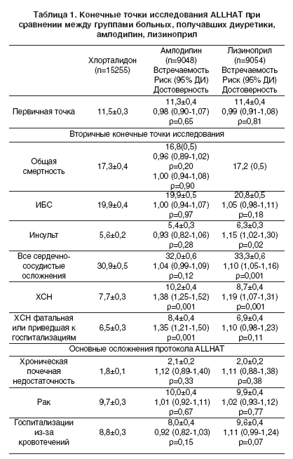 Следует отметить, что все результаты представлены в виде сравнения применения блокаторов кальциевых каналов либо ингибитора АПФ с диуретиками. Сравнение групп лечения амлодипином и лизиноприлом не проводилось. Результаты исследования ALLHAT представлены в таблице 1.