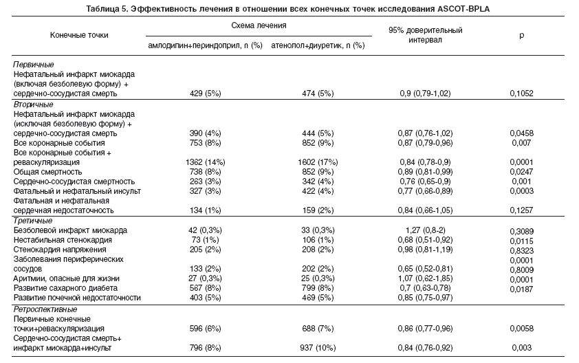 Итак, каковы же результаты исследования ASCOT-BPLA? Прежде всего, результаты оказались настолько значимыми, что в октябре 2004 года было принято решение о досрочном прекращении исследования, поскольку наблюдались достоверные отрицательные результаты в группе, получающей бета-блокатор и диуретик, по сравнению с пациентами, получающими блокаторы кальциевых каналов и ингибитор АПФ. Основные результаты исследования представлены в таблице 5.
