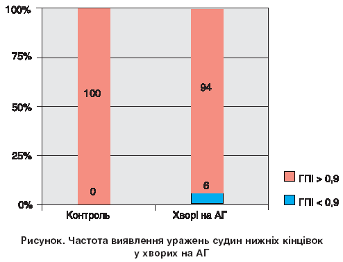 Частота виявлення гомілково-плечового індексу менше 0,9 серед безсимптомних хворих на АГ становила 6%. У контрольній групі осіб зі зниженим рівнем гомілково-плечового індексу виявлено не було. Різниці у частоті виявлення зниженого рівня гомілково-плечового індексу між хворими на АГ з різним ступенем підвищення АТ у нашому дослідженні виявлено не було.