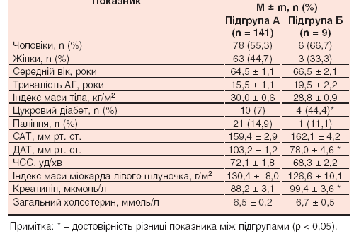 Для детального аналізу ми розділили усіх хворих на АГ залежно від величини гомілково-плечового індексу на дві підгрупи: до підгрупи А увійшли хворі (n = 141) з величиною індексу > 0,9, до підгрупи Б (n = 9) – з величиною індексу відповідно < 0,9. Дані про основні демографічні та клінічні параметри хворих підгруп А і Б наведено в таблиці. Як видно з таблиці, хворі обох підгруп не різнилися за віком, статтю, величиною індексу маси тіла, частотою паління та вмістом загального холестерину у сироватці крові. При цьому слід зазначити, що пацієнти в обох підгрупах мали значно підвищений рівень загального холестерину в сироватці крові порівняно з нормою. Також не було виявлено різниці між підгрупами за величиною індексу маси міокарда.