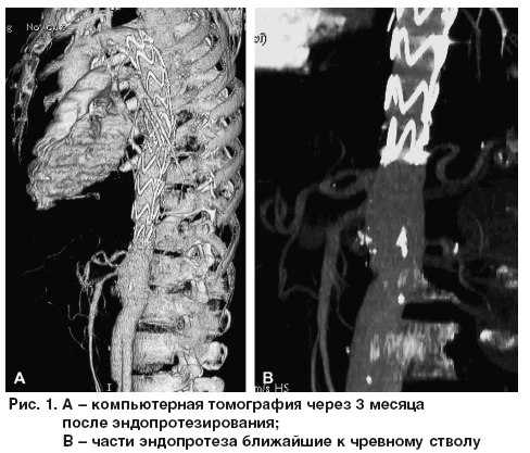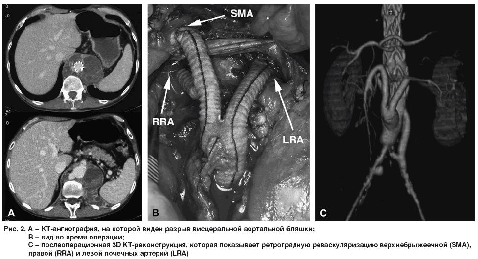 Во время проведения последнего обследования при КТ-ангиографии обнаружен разрыв висцеральной аортальной бляшки (рис. 2 А), и больной подвергся срочной операции. На тот момент у пациента не было каких-либо признаков инфекции по данным клинических, лабораторных или КТ-исследований. Ретроградная реваскуляризация из аортального протеза в почечные артерии и верхнебрыжеечной артерии проведена с помощью тройного протеза (6-миллиметровый прямой дакроновый протез, сшитый с раздвоенным протезом 14 х 7 мм). Прямой стент Talent 28-28-130 введен через 10-миллиметровый вспомогательный протез к основе тройного протеза (рис. 2 В, С). Ангиограмма во время процедуры и послеоперационная КТ-ангиография показали раскрытое состояние реваскуляризированных почечных и брыжеечной артерий и никаких признаков просачивания. После операции был назначен цефуроксим (1 г внутривенно три раза в день в течение 7 дней), и затем ципрофлоксацин (500 мг per os дважды в день в течение месяца). Больной был выписан на 8-й день после операции без почечных и висцеральных ишемических осложнений. Через 9 месяцев пациент чувствовал себя нормально, при проведении КТ было обнаружено полное выключение аневризмы.