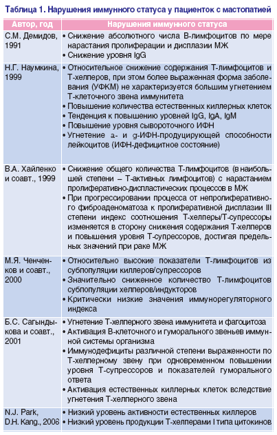 По данным М.Я. Ченченкова и соавт. (2000), типичные и выраженные отклонения в функционировании иммунной системы при мастопатии представлены нарушением регуляции иммунного ответа с резко выраженной патологией по типу относительно высоких показателей Т-лимфоцитов из субпопуляции киллеров/супрессоров и значительно сниженным количеством Т-лимфоцитов субпопуляции хелперов/индукторов. Это выражается в критически низких значениях иммунорегуляторного индекса. Выявленные нарушения при первичном обследовании часто базируются на иммунодефицитных состояниях по Т-клеточному или смешанному типу. Такое сочетание иммунорегуляторных клеток определяет слабую иммунную защиту организма (иммунологическую резистентность) от индикации, различных внешних экологических и химических воздействий, способствует развитию множественной соматической патологии и хронизации воспалительных процессов.