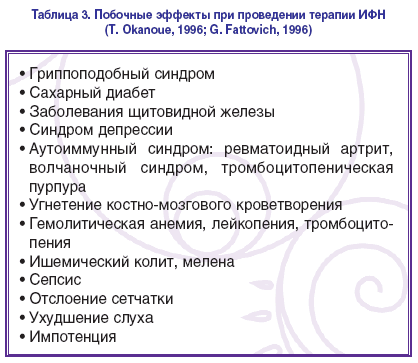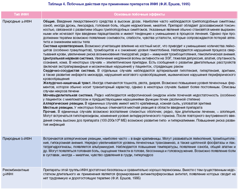 Однако главным определяющим фактором, ограничивающим широкое применение препаратов ИФН в клинической практике, являются побочные эффекты. Их выраженность широко варьирует и зависит от целого ряда обстоятельств: состава препарата (класс ИФН, стабилизаторы, входящие в состав препарата), режима дозирования, пути введения, лекарственной формы препарата и состояния пациента (табл. 3, 4). В целом около 10% больных прекращают лечение вследствие развития побочных эффектов.