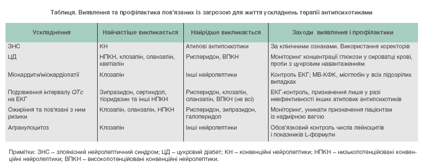 Особливої уваги потребує співвідношення терапевтичної ефективності та безпеки практичного використання нейролептиків [11]. Основними ускладненнями психофармакотерапії антипсихотиками, що становлять загрозу для життя, є: злоякісний нейролептичний синдром; агранулоцитоз, що призводить до сепсису; цукровий діабет, який викликає кетоацидоз, ангіо- і нейропатії; ожиріння та пов’язані з ним ризики (ішемічної хвороби серця, цукрового діабету, підвищеної частоти онкопатології, смертності від захворювань, втрати працездатності та інших соціальних функцій і т.ін.); міокардити, зміни на ЕКГ інтервалу QT, атерогенез та пригнічення дихального центру, що небезпечні розвитком серцевої недостатності, фатальними аритміями, так званою раптовою серцевою смертю.