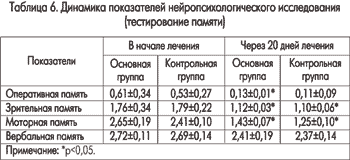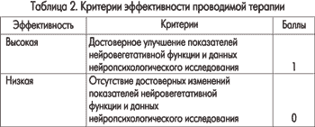 Оценку эффективности препарата производили по критериям: положительная динамика показателей нейровегетативных функций и данных нейропсихологического исследования. Эффективность оценивали на основании вышеперечисленных критериев в баллах по следующей шкале (табл. 2).