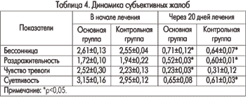 Согласно полученным данным отмечается статистически достоверная позитивная динамика в отношении снижения выраженности бессонницы, раздражительности, чувства тревоги (p<0,05). Обращает на себя внимание идентичность полученных результатов в обеих группах.