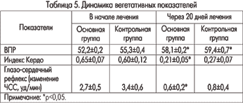 Анализ результатов ортоклиностатической пробы выявил избыточное вегетативное обеспечение различной степени выраженности (показатель преобладания активности симпатического отдела вегетативной нервной системы) у 83,3% больных основной группы и у 90% — контрольной. При оценке данного показателя после проведенного лечения избыточное вегетативное обеспечение наблюдалось у 16,7 и 26,7% больных (основной и контрольной групп).