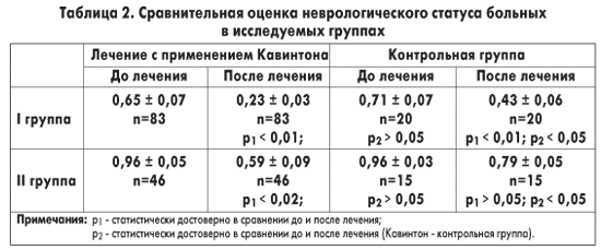 Монотерапия Кавинтоном также дала достоверно лучшие результаты лечения больных II группы в сравнении с контрольной (табл. 2). В основной группе монотерапии Кавинтоном наблюдался более быстрый и выраженный клинический результат: исчезновение или значительное уменьшение головной боли, головокружений, повышение умственной и физической трудоспособности, улучшение концентрации внимания и оперативной памяти, объективное уменьшение частоты возникновения неврологической симптоматики.