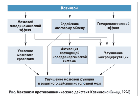 Сложный механизм развития ХЦИ, обусловленный грубыми нарушениями клеточно-мембранного потенциала и адаптационно-приспособительных механизмов [7,8], диктует необходимость объективного и взвешенного подхода к выбору адекватной терапии: назначению вазоактивных препаратов, ноотропов, адаптогенов, витаминов, а также лекарственных средств, угнетающих процессы перекисного окисления. Накоплен большой опыт клинического применения препарата Кавинтон (этиловый эфир аповинкаминовой кислоты, винпоцетин). В работах разных авторов [2,9] отмечается, что Кавинтон выборочно улучшает кровоснабжение головного мозга путем усиления мозгового кровотока и снижения сопротивления сосудов головного мозга. Он улучшает микроциркуляцию, снижает агрегацию тромбоцитов и повышенную вязкость крови, повышает эластичность эритроцитов, что улучшает переносимость гипоксии клетками мозга, а также обладает ноотропными свойствами, которые подтверждены научными исследованиями (рис.).