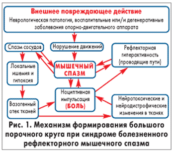 Самым значимым компонентом синдрома болезненного рефлекторного мышечного спазма является боль. Раздражение окончаний чувствительных нервов может происходить под воздействием как физических факторов, так и эндогенных веществ, вызывающих боль (брадикинин, простагландины, лейкотриены, серотонин и др.). Специфическая болевая (ноцицептивная) импульсация поступает через задние корешки в нейроны задних рогов спинного мозга. Болевая импульсация активирует a- и g-мотонейроны передних рогов спинного мозга, что усиливает спастическое сокращение мышцы, иннервируемой данным сегментом спинного мозга. В то же время мышечный спазм, возникающий при сенсомоторном рефлексе, усиливает стимуляцию ноцицепторов мышцы. Так по механизму обратной связи формируется замкнутый порочный круг: спазм — боль, спазм — боль.