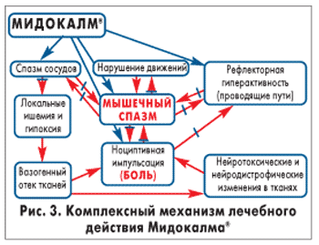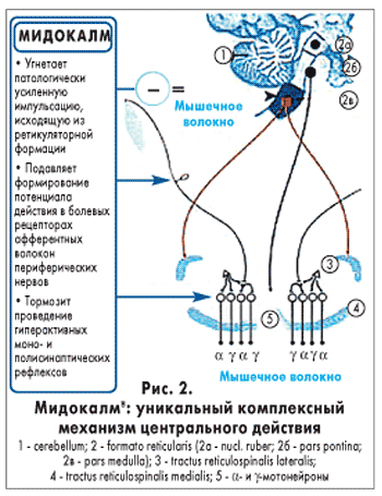 Во всех работах отмечена высокая эффективность и безопасность Мидокалма в лечении синдромов, связанных с повышенным тонусом мышц, болями и нарушением трофики. Оказывая мембраностабилизирующий эффект, Мидокалм подавляет формирование и проведение потенциалов действия в гиперстимулированных мотонейронах ствола мозга и в периферических нервах, регулирует функции активирующих и тормозных ретикулоспинальных путей и дозозависимо ингибирует проведение в спинном мозге моно- и полисинаптических рефлексов, вызываемых, в том числе, болевыми стимулами.