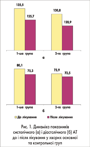 Для дослідження стану кровообігу всім хворим проводилося вимірювання артеріального тиску двічі на добу у фіксований час згідно з методичними принципами, розробленими експертами ВООЗ. Динаміка показників артеріального тиску відображена на рис. 1.