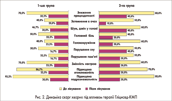Найбільш часті скарги хворих з астеноневротичним синдромом, обумовленим вегетосудинною дистонією, артеріальною гіпертензією, церебральним атеросклерозом, інфекційними захворюваннями нервової системи, посттравматичними станами, і їх динаміка під впливом терапії Гліцисед-КМП представлені на рис. 2.