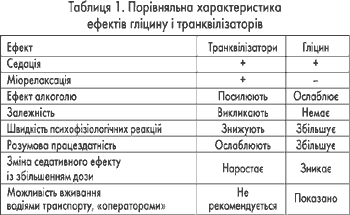 Гліцин виявляє стресопротекторну, антистресову і ноотропну дію. У функціональному плані дія гліцину проявляється в заспокійливому ефекті. При цьому послабляються психоемоціональні реакції, їх прояви стають більш адекватными: зменшується подразнювальність, агресивність, конфліктність, поведінка стає «більш розумною». Маючи заспокійливу дію, гліцин за іншими властивостями принципово відрізняється від відомих транквілізаторів (табл. 1). Його використання дозволяє уникнути вживання транквілізаторів і зменшити ризик виникнення токсикоманій [6].