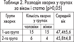 У групі хворих, які отримували досліджуваний препарат (група 1) і препарат порівняння — Гліцин (МНПК «Біотика», Росія) (група 2) були включені хворі, практично рівнозначні за віком (табл. 2).