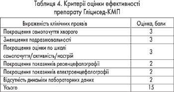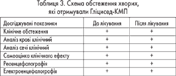 Усім хворим 1-ї і 2-ї груп Гліцисед-КМП та Гліцин призначалися по однаковій схемі по 2 таблетки 3 рази на день протягом 20-30 днів. До лікування і після закінчення курсу лікування хворих обстежували відповідно до розробленої схеми (табл. 3).
