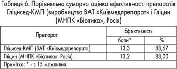 За даними літератури і власних спостережень, Гліцисед-КМП добре переносився хворими. У процесі проведення клінічних досліджень в обох групах не було відмічено випадків підвищеної чутливості до Гліцисед-КМП, що свідчить про хорошу переносимість препарату. На основі результатів клінічних випробувань була проведена сумарна оцінка ефективності препаратів (табл. 6).