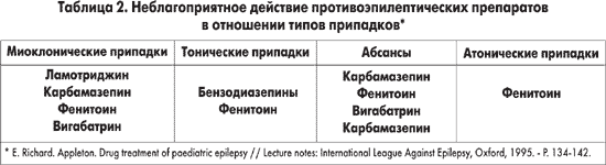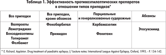 Особое значение в современной эпилептологической практике имеют Топамакс и соли валпроевой кислоты, они эффективны при всех типах припадков, не оказывают неблагоприятного действия ни на один из типов припадков (табл. 1, 2).