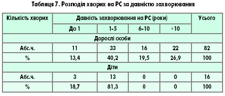 У таблиці 7 наведені дані про розподіл хворих на РС за давністю захворювання.