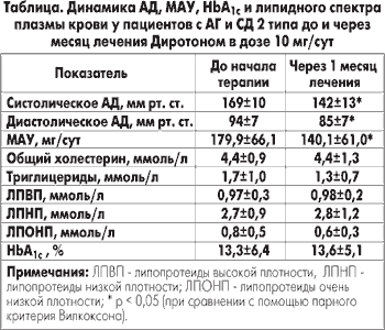 Динамика изученных показателей представлена в таблице. Представленные данные свидетельствуют о высокой антигипертензивной активности Диротона и способности препарата снижать МАУ через месяц лечения, причем эти результаты достигнуты у больных с декомпенсированным СД. Отсутствие достоверных сдвигов в липидном спектре плазмы, по-видимому, обусловлено непродолжительным сроком наблюдения и ограниченным числом пациентов.