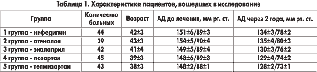В исследование вошло 5 групп пациентов (213 человек), которым в течение не менее двух лет проводили гипотензивную монотерапию в связи с наличием мягкой, пограничной гипертензии либо нормально повышенного давления (139/89 мм рт. ст.) с риск-факторами. В первой группе пациенты принимали нифедипин в дозе 10 мг дважды в день, либо в ретард-дозе один раз в сутки. Вторая группа получала атенолол (100-150 мг в сутки), третья — эналаприл (10 мг дважды в сутки), четвертая — лозартан (50 мг 1-2 раза в сутки), пятая — телмизартан (80 мг в сутки) (табл. 1). Доза препаратов подбиралась индивидуально до достижения целевого АД, составляющего менее 140/90 мм рт. ст. при наличии изначальной гипертензии и менее 139/85 мм рт. ст. при наличии сопутствующих риск-факторов.