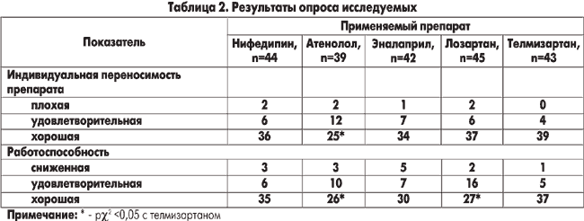 Снижение работоспособности, согласно результатам индивидуального опроса больных, проявлялось в некотором уменьшении выносливости и толерантности к повышенным нагрузкам, более быстром появлении чувства утомляемости к концу дня и рабочей недели. Лучшим среди препаратов по переносимости лечения явился телмизартан, одновременно обладая предпочтительным профилем влияния на трудовую деятельность. Достоверные отличия работоспособности выявлены в группах, принимавших атенолол и лозартан в сравнении с телмизартаном. Сниженная работоспособность в виде понижения внимания при приеме телмизартана у одного из пациентов, вероятно, была обусловлена гипотонией в утренние часы (препарат принимался утром). Переход на прием «перед сном» позволил ликвидировать жалобу на снижение работоспособности.