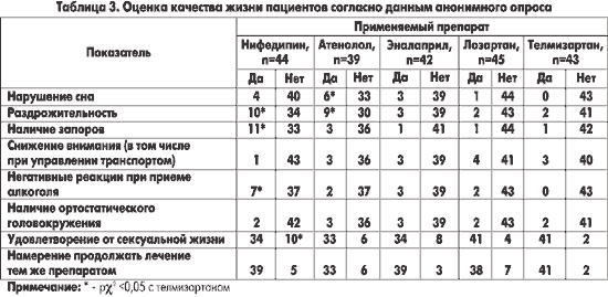 Обращает на себя внимание оценка пациентами своей сексуальной жизни. Практически все негативные ответы были даны лицами мужского пола. Среди жалоб преобладали снижение либидо и эректильные дисфункции преимущественно у пациентов с высокой симпатической активностью. Наибольшая частота сексуальных расстройств наблюдалась при приеме нифедипина (33%) и эналаприла (27%), несколько меньшая — атенолола (23%) и лозартана (13%), наименьшая — телмизартана (7%). Подробный опрос пациентов позволил установить, что первые 3-6 месяцев после начала гипотензивной терапии до 60% больных испытывали снижение потенции. Это снижение являлось транзиторным, так как позже в большинстве случаев потенция восстановилась. Разъяснение временности этого побочного эффекта позволило избежать отказа от лечения у каждого третьего пациента.