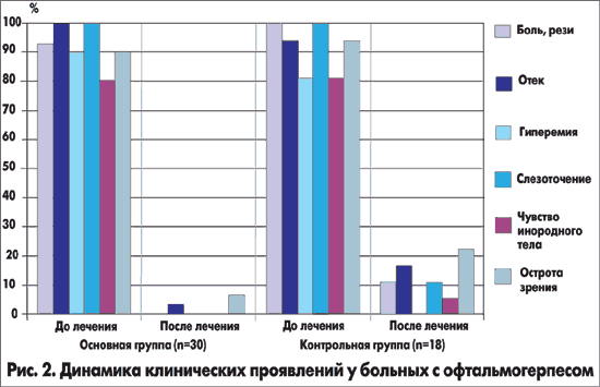 Из приведенных данных (рис. 2) видно, что после первого курса комплексной терапии с использованием Окоферона удалось купировать основные клинические признаки заболевания — болевые ощущения и чувство жжения, слезотечение, гиперемию, отечность конъюнктивы век и кожных складок.