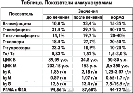 В нашей клинике проводилось лечение препаратом Тонзилгон Н больных с паратонзиллитами и паратонзиллярными абсцессами (64 пациента), после выполненной тонзиллэктомии (39), хроническим фарингитом (52), из них катаральной формой (25), гипертрофической формой (27), декомпенсированной формой хронического тонзиллита (67), хроническим гипертрофическим ринитом у ликвидаторов аварии на ЧАЭС (33). При хроническом тонзиллите и фарингите препарат назначали по 2 драже 3 раза в сутки в течение месяца, при паратонзиллитах и паратонзиллярных абсцессах и после тонзиллэктомии — по 2 драже (или 25 капель) 6 раз в сутки на протяжении 14 дней. Больным с хроническими ринитами препарат назначался в послеоперационном периоде по 2 драже 6 раз в сутки на протяжении месяца. Больные были разделены на две группы, в основной (принимавшей Тонзилгон Н) при паратонзиллите и паратонзиллярном абсцессе проводилось вскрытие абсцесса, назначалась антибактериальная терапия и Тонзилгон Н, в контрольной — только вскрытие абсцесса и антибактериальная терапия. При хроническом тонзиллите и фарингите в основной группе назначали Тонзилгон Н, а в контрольных при хроническом тонзиллите — промывание лакун миндалин, физиотерапия (ингаляции, УФО), при хроническом фарингите — смазывание глотки раствором Люголя, физиотерапия (ингаляции, УФО). Нормализация фарингоскопической картины у больных с острыми заболеваниями глотки и после тонзиллэктомии в основной группе наблюдалась раньше, чем в контрольной. Койко-день у больных с паратонзиллитами и паратонзиллярными абсцессами, пролеченных Тонзилгоном Н в составе комплексной терапии, составил 3,7, тогда как в контрольной группе — 4,7. С целью углубленного изучения эффективности препарата Тонзилгон Н у больных исследовались иммунологические показатели до и после приема препарата (уровень Т-лимфоцитов и их субпопуляций в периферической крови, активность природных цитотоксических клеток, уровень иммуноглобулинов А,M,G в сыворотке крови, уровень ЦИК, уровень фагоцитоза, комплементарная активность сыворотки крови). Отмечено, что у больных из основной группы эти показатели к концу лечения нормализовались (табл.).