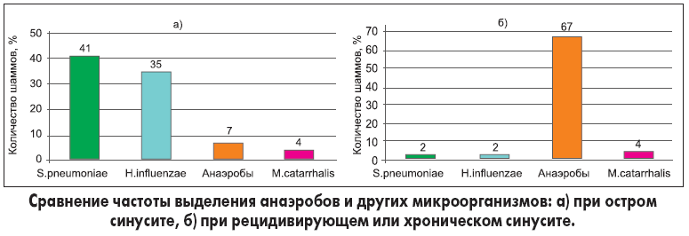 При рецидивирующих тонзиллофарингитах основной целью этиотропной терапии является эрадикация β-гемолитического стрептококка группы А. Результаты катамнестических исследований показывают, что частота обострений тонзиллофарингита в течение 1-го года достоверно ниже после курса терапии ингибиторозащищенным пенициллином (около 10%), чем после лечения обычным пенициллином (около 60%). Оказалось, что при рецидивирующем тонзиллофарингите (как, впрочем, и при рецидивирующем синусите) повторные случаи заболевания могут быть связаны с формированием ассоциаций аэробных и анаэробных бактерий. Сам стрептококк (аэробный) in vitro может демонстрировать высокий уровень чувствительности к пенициллину, но в гипертрофированной ткани миндалин или в толще воспаленной слизистой оболочки придаточных пазух носа к нему часто присоединяется другой участник ассоциации – анаэробный микроорганизм, например, из семейства бактероидов. Способностью к продукции β-лактамаз большинство анаэробов наделено природно. При наличии хронических очагов инфекции β-лактамазы продуцируются анаэробами более чем в 90% случаев, разрушают пенициллин и не дают последнему проявить свой лечебный эффект в отношении чувствительного стрептококка. Такая «круговая порука», с одной стороны, позволяет микроорганизмам выживать, а с другой – проявляется в клинике рецидивирующими заболеваниями ЛОР-органов, несмотря на проводимое лечение. Как часто участниками воспаления становятся анаэробы, наглядно показано на рисунке при сравнении данных об этиологии острого и рецидивирующего синусита. Здесь же показано, что при рецидивирующем течении воспаления возрастает этиологическая значимость золотистого стафилококка (S. aureus).