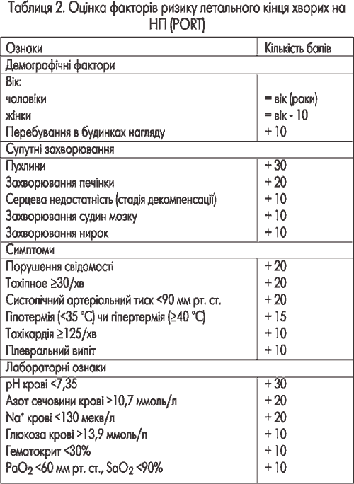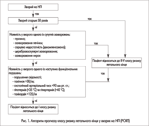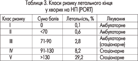 Для об’єктивної оцінки тяжкості перебігу і прогнозу НП доцільно застосовувати шкалу факторів ризику летального кінця PORT (за результатами дослідження the Pneumonia Patient Outcomes Research Team), яка є найбільш поширеною та апробованою. У хворих віком не старше за 50 років, за відсутності супутніх захворювань та життєво небезпечних функціональних порушень, спостерігається дуже низький ризик летального кінця (клас I ризику) (рис. 1). У хворих віком понад 50 років проводять оцінку в балах даних про вік, наявність супутніх захворювань, життєво небезпечних функціональних порушень, а також даних епідеміологічних, лабораторних і рентгенологічних досліджень (табл. 2). Відповідно до сумарної бальної оцінки ознак захворювання (прогностичних критеріїв) визначають ІІ-V клас ризику летального кінця при НП (табл. 3). Пацієнти з ризиком I-II класу мають мінімальну ймовірність летального кінця і можуть лікуватися амбулаторно. Пацієнти з ризиком ІII класу лікуються також амбулаторно або можуть нетривалий час (до 4 діб) перебувати в стаціонарі. Ті хворі, у яких сумарна бальна оцінка відповідає IV і V класу ризику, безумовно підлягають госпіталізації.