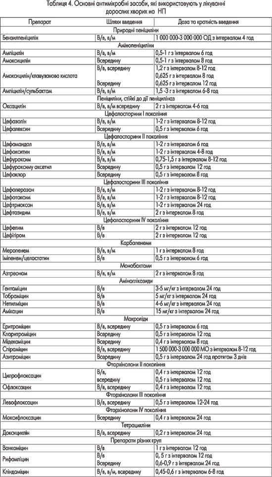 Діагноз НП — безумовне показання для застосування антибіотиків, які є основою лікування у таких хворих. Антибактеріальне лікування необхідно починати одразу після встановлення діагнозу, особливо в тих пацієнтів з НП, які потребують госпіталізації. Абсолютно неприйнятне є зволікання з терміновим призначенням антибіотиків тяжким хворим через відсутність результатів бактеріоскопії і посіву мокротиння, оскільки затримка на 8 год і більше введення першої дози антибіотика зумовлює значне підвищення летальності серед таких хворих.