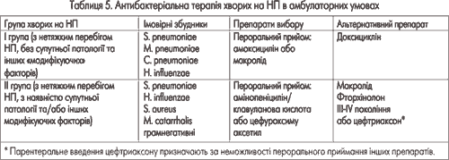У хворих на НП I групи (з нетяжким перебігом захворювання, які не потребують госпіталізації, без супутньої патології та інших «модифікуючих» факторів) адекватний клінічний ефект можливий при пероральному прийманні антибактеріальних хіміопрепаратів (табл. 5). Як засіб вибору рекомендують амоксицилін (призначати ампіцилін всередину недоцільно через його низьку біодоступність) або макролід (азитроміцин, еритроміцин, кларитроміцин, мідекаміцин, спіраміцин). In vitro амоксицилін не перекриває весь спектр потенційних патогенів, проте за даними контрольованих клінічних досліджень не виявлено відмінностей в ефективності лікування із застосуванням антибіотиків цих груп, а також окремих представників класу макролідних антибіотиків. Як альтернативний препарат рекомендують призначати тетрациклін (доксициклін). Цим пацієнтам вважають недоцільним призначати фторхінолони.