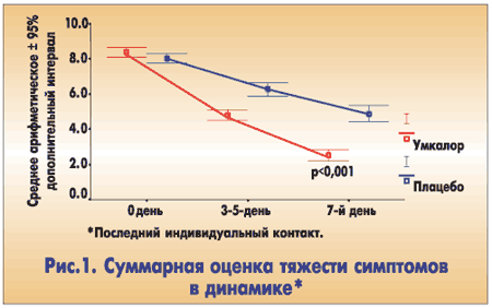 На рисунке 1 представлена динамика изменения суммарной оценки симптомов по шкале оценки степени тяжести бронхита от дня 0 до 7-го дня (n=468). В группе Умкалор, обозначенной красной линией, данный показатель уменьшался, в среднем, с 8,4 балла в начале до 2,5 балла на 7-й день лечения. В группе плацебо, обозначенной синей линией, этот показатель понижался в значительно меньшей степени. Данное различие является статистически достоверным.