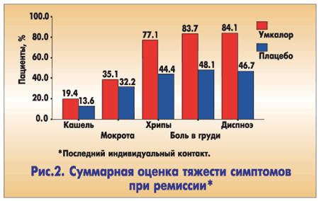 Такие симптомы, как хрипы в легких при аускультации, боль в груди, одышка, являющиеся показателями острого воспаления, исчезли у 80% пациентов группы Умкалор к моменту второго обследования.