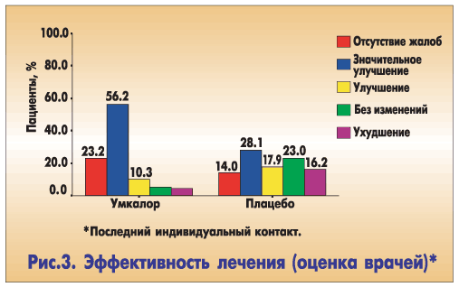 На рисунке 2 представлена степень регресса отдельных симптомов по шкале оценки тяжести симптомов бронхита, то есть процент пациентов, у которых на 7-й день указанные симптомы не проявлялись. Установлено, что при всех симптомах регресс при приеме Умкалора был достоверно выше, чем при приеме плацебо.