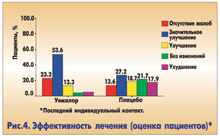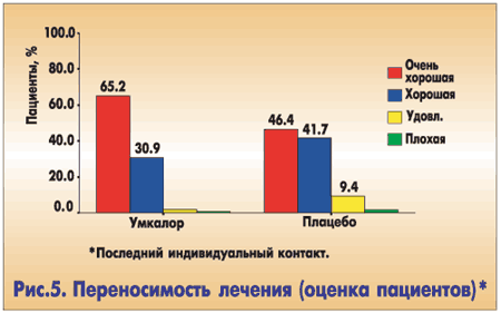 Врачи оценили эффективность лечения препаратом Умкалор у этих больных как «выздоровление» или «значительное улучшение» (рис.3). Оценка результатов лечения пациентами в целом совпадала с оценкой врачей (рис.4); переносимость Умкалора была оценена как «отличная» и «очень хорошая» у 96% пациентов (рис.5).