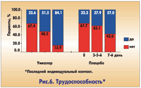 При лечении бронхита фитоантибиотиком Умкалор немаловажную роль играет также степень восстановления трудоспособности (рис. 6). Красная линия показывает нетрудоспособность, синяя — трудоспособность. В начале курса лечения 67% пациентов обеих групп были нетрудоспособны. В группе Умкалора через 7 дней только 16% пациентов оставались нетрудоспособными, в группе плацебо — 43%.