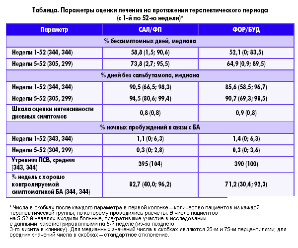В исследовании приняли участие 688 пациентов (по 344 в каждой терапевтической группе). Обе группы были хорошо сбалансированы по демографическим показателям и исходным параметрам здоровья. У всех участников исследования наблюдался субоптимальный контроль симптомов БА. Пациенты в обеих терапевтических группах характеризовались одинаковым количеством бессимптомных дней в течение последней недели вводного периода (в среднем 5%). В таблице представлены параметры, по которым оценивалась эффективность проведенного лечения.