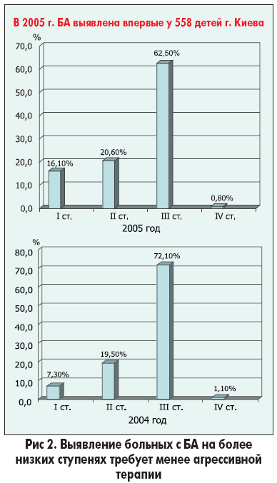 Поздняя диагностика БА. Остается открытым вопрос запоздалой диагностики БА у детей, в среднем на 4-5 лет, на уровне первичного звена амбулаторной помощи (рис. 1). До сих пор участковые педиатры редко диагностируют БА, диагноз, как правило, устанавливают аллерголог или пульмонолог зачастую тогда, когда заболевание приобретает уже среднетяжелое и тяжелое течение (рис. 2), что существенно влияет на прогноз и исход БА.