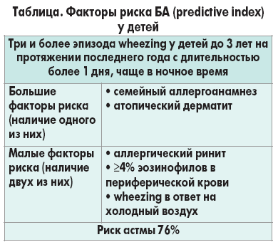 Дети с рецидивирующим wheezing, наличием полиорганных проявлений атопии (атопического дерматита и/или аллергического ринита), наличием семейного аллергоанамнеза имеют высокий риск формирования БА. Вероятность диагноза повышается при наличии повышенного содержания IgE и специфических IgE к разным аэроаллергенам, периодичности возникновения признаков, наличии ночной симптоматики, сезонных обострений и симптомов, возникающих после контакта с аллергенами или физического напряжения, эффективности противоастматической терапии.