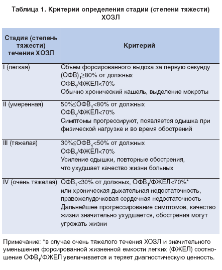 Выделяют 4 стадии ХОЗЛ в зависимости от степени тяжести течения заболевания, которые определяют по результатам обследования больного в клинически стабильный период при отсутствии обострений. При этом учитывают выраженность клинических признаков заболевания и функциональных характеристик бронхообструктивного синдрома (табл. 1) [17].