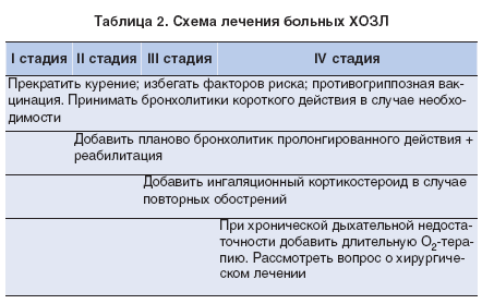 Лечение больных ХОЗЛ в стабильный период носит ступенчатый характер: ступенчатое увеличение объема терапии в зависимости от тяжести течения заболевания – так называемый эскалатор (табл. 2) [4, 17].
