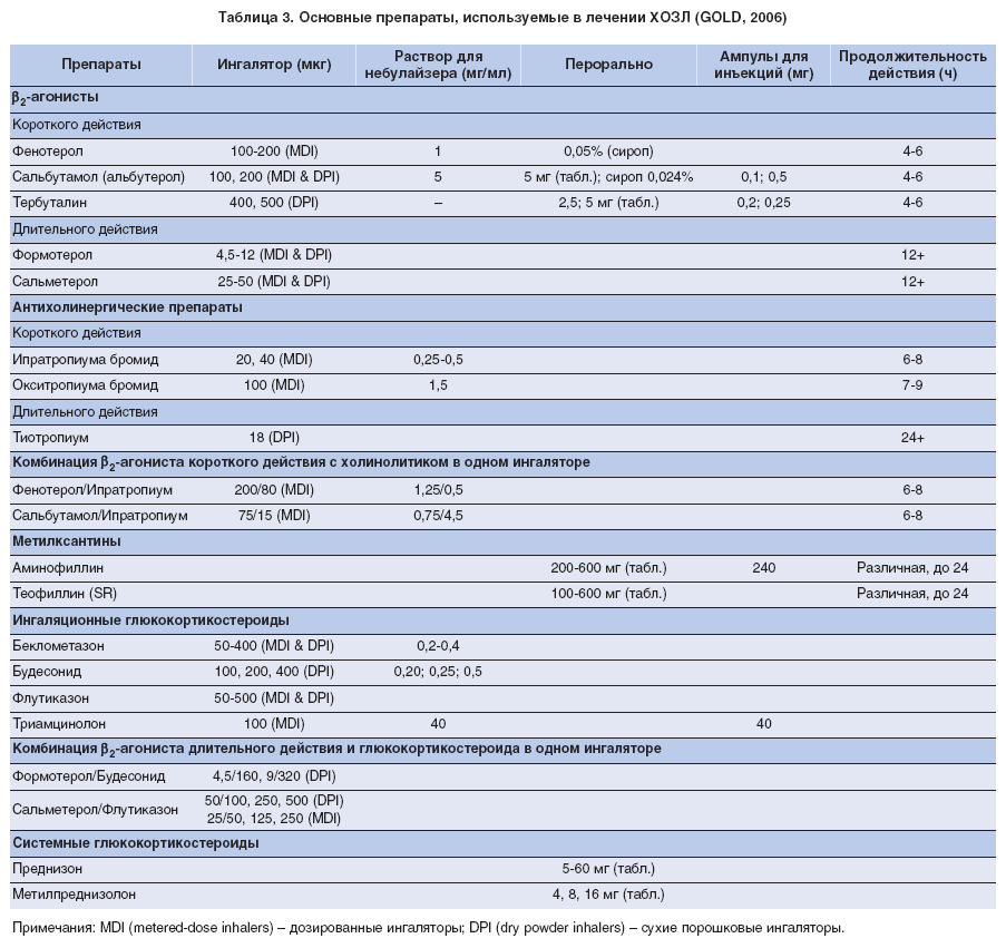 Средства лекарственной терапии ХОЗЛ, которые рекомендуются программой GOLD (2006), приведены в таблице 3.