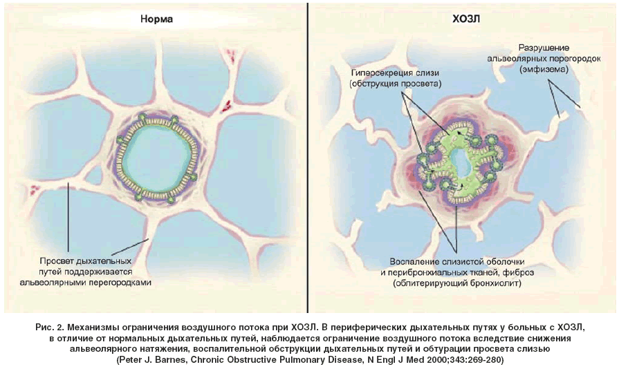 Согласно современной концепции, ХОЗЛ имеет воспалительную природу и рассматривается как хроническое, диффузное, неаллергическое, персистирующее воспаление бронхов, паренхимы и сосудов легких