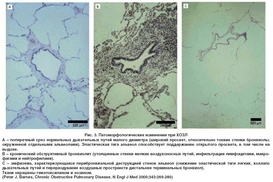 Ограничение воздушного потока дыхательных путей при ХОЗЛ обусловлено сочетанием поражения бронхов (хронический обструктивный бронхит) и разрушения паренхимы легких (эмфизема). Соотношения этих составляющих бронхиальной обструкции индивидуально варьируют. Ремоделирование и сужение бронхов, разрушение альвеолярных перегородок, снижение эластической тяги легких уменьшают возможность удерживать дыхательные пути открытыми во время выдоха [4, 21, 22]. В результате значительно удлиняется время выдоха, происходит увеличение функционального остаточного объема легких, развивается легочная гиперинфляция (повышенная воздушность). Это приводит к ограничению возможности больного сделать полноценный вдох, нарушению легочной вентиляции и газообмена. Появляется одышка – изменение частоты и глубины дыхания, сопровождающееся субъективным ощущением нехватки воздуха. Данное состояние возникает у больных ХОЗЛ при физическом напряжении (динамическая гиперинфляция), в дальнейшем – при прогрессировании заболевания и в покое (статическая гиперинфляция). Таким образом, развитие легочной гиперинфляции при ХОЗЛ играет ключевую роль в возникновении и прогрессировании наиболее значимого симптома – одышки. Именно одышка является основным фактором снижения качества жизни пациентов с ХОЗЛ [75]. Патоморфологические изменения в легочной ткани при ХОЗЛ представлены на рисунках 2 и 3.