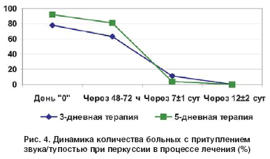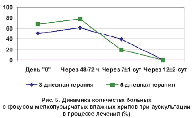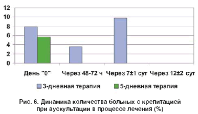 Количество больных с притуплением звука/тупостью при перкуссии, мелкопузырчатыми влажными хрипами или крепитацией при аускультации в процессе лечения в группах сравнения представлено на рисунке 4, 5, 6, динамика показателей крови (количество лейкоцитов и СОЭ) – в таблице 3. Статистически значимых различий в изученных показателях между группами 3- и 5-дневного лечения не было.