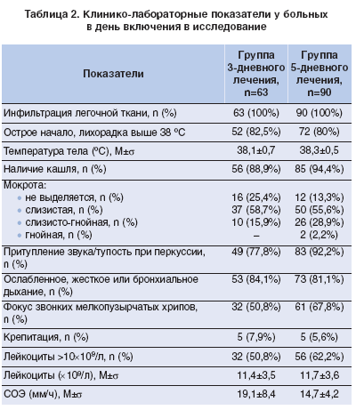 Все больные обследовались по общепринятому плану. В перечень обязательных диагностических мероприятий входили: сбор жалоб и анамнеза заболевания, объективное исследование, включая осмотр, перкуссию и аускультацию легких, клинико-лабораторные (определение количества лейкоцитов, нейтрофилов, СОЭ периферической крови, клинический анализ мокроты) и инструментальные (рентгенологическое исследование органов грудной клетки) методы исследования. Предварительная оценка эффективности проводилась через 48-72 ч от начала терапии. В случаях снижения температуры тела ниже 37,5