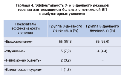 Полученные данные свидетельствуют о сопоставимой клинической эффективности и переносимости 3- и 5-дневного режимов перорального лечения азитромицином больных с нетяжелой ВП без сопутствующих заболеваний и «модифицирующих» факторов. Средняя продолжительность лечения по поводу ВП (т. е. пребывания на больничном листе или на справке) в обеих группах также не различалась.